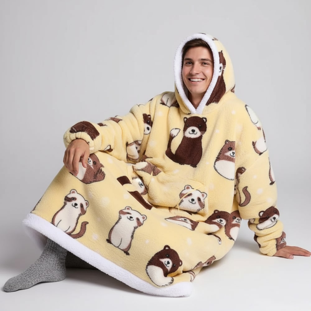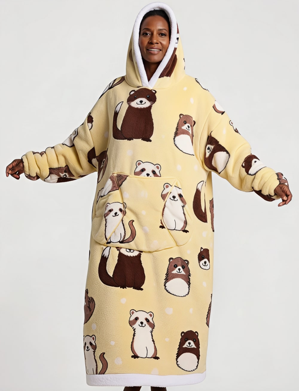 Ce sweat plaid long mise tout sur la tendresse avec ses motifs d’adorables petits animaux au style cartoon. Sa couleur jaune pâle apporte une touche lumineuse et joyeuse, idéale pour égayer les journées froides. Contrairement aux modèles classiques, il dispose d’une poche 3-en-1 spacieuse, parfaite pour garder les mains bien au chaud ou même accueillir ton compagnon à quatre pattes. Il t’offre un cocon de chaleur du haut de la capuche jusqu’aux chevilles. Un choix original pour ceux qui veulent allier fun, confort et douceur polaire.